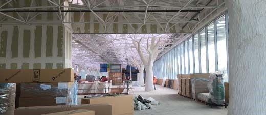 Structure de la mezzanine achevée, toitures, vitrages et ombrières posés. Le nouveau visage de la future gare de Nantes commence à se dessiner de plus en plus précisément. Les 18 piliers en forme d’arbre qui soutiennent la charpente de la mezzanine, ont pris racine au rez-de-chaussée dans les quais et le hall, pour s’élever sur toute la longueur de cette future rue commerçante qui culmine à 18 m de hauteur. Composés d’une structure métallique, ils sont recouverts d’un flocage garantissant la stabilité au feu de la structure, et d’un habillage en béton projeté et sculpté, rendant les poteaux semblables à des arbres centenaires. Le travail a été réalisé par l’Atelier Artistique de Béton spécialisé dans les décors de parcs d’attractions.