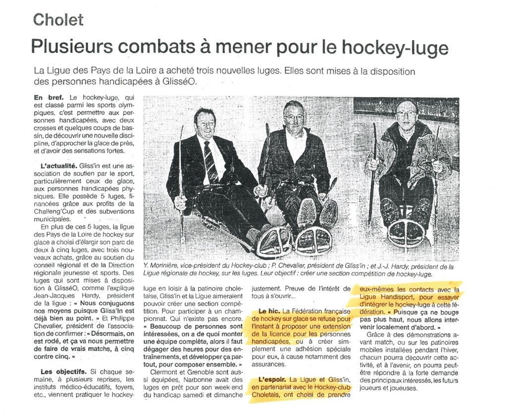 Les bilans remis par les clubs ou les ligues soutenus sont parfois accompagnés d’articles qui commentent l’évolution du sport et de sa pratique en Pays de la Loire. Ici un article d'Ouest France, édition Maine-et-Loire du 24 novembre 2008 évoque l'adoption progressive de matériel adapté au handisport.